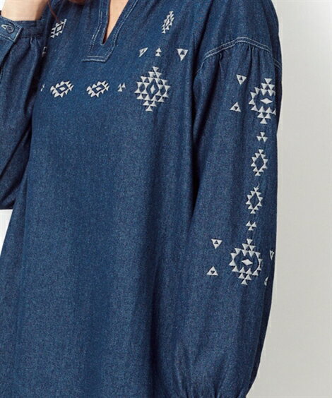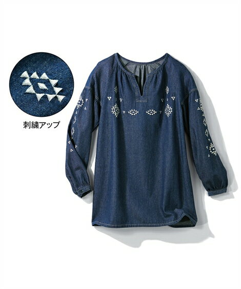 チュニック 大きいサイズ レディース 綿100% 刺しゅう入 ゆるシルエット デニム ブラウス ウオッシュドブルー/ネイビー 8L/10L ニッセン