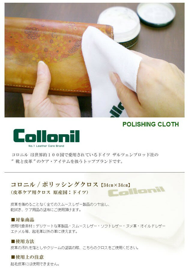 ・主成分/構成要素:コットン ・使用対象素材:スムースレザー ・注意:起毛製品には使用出来ません ・ドイツ・コロニル社 (マイクロファイバー製ポリッシングクロス) ・本体サイズ(約):縦34cm×横34cm ・重量(約):260g ワックス(油性タイプ)や汚れ落としを使用する際に最適なクロスです。